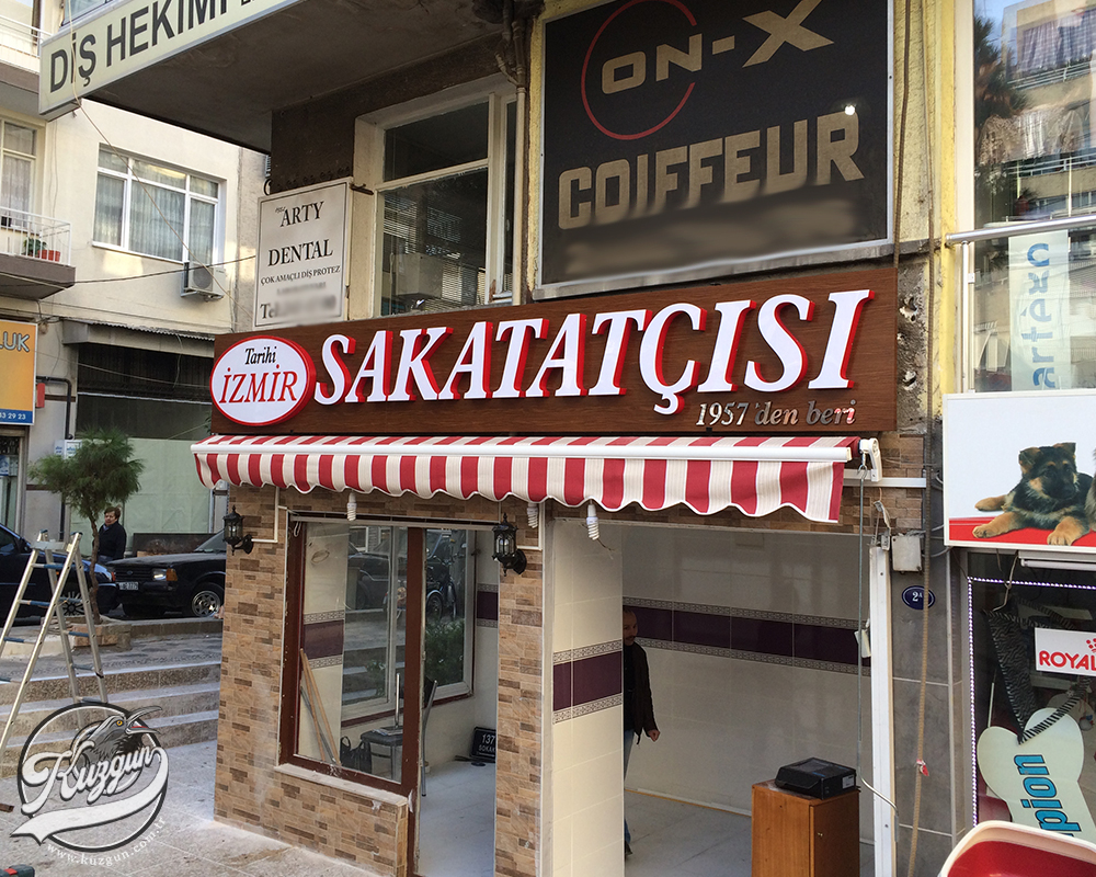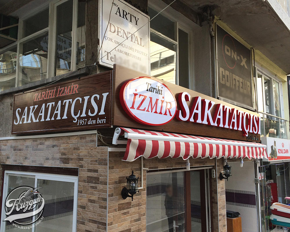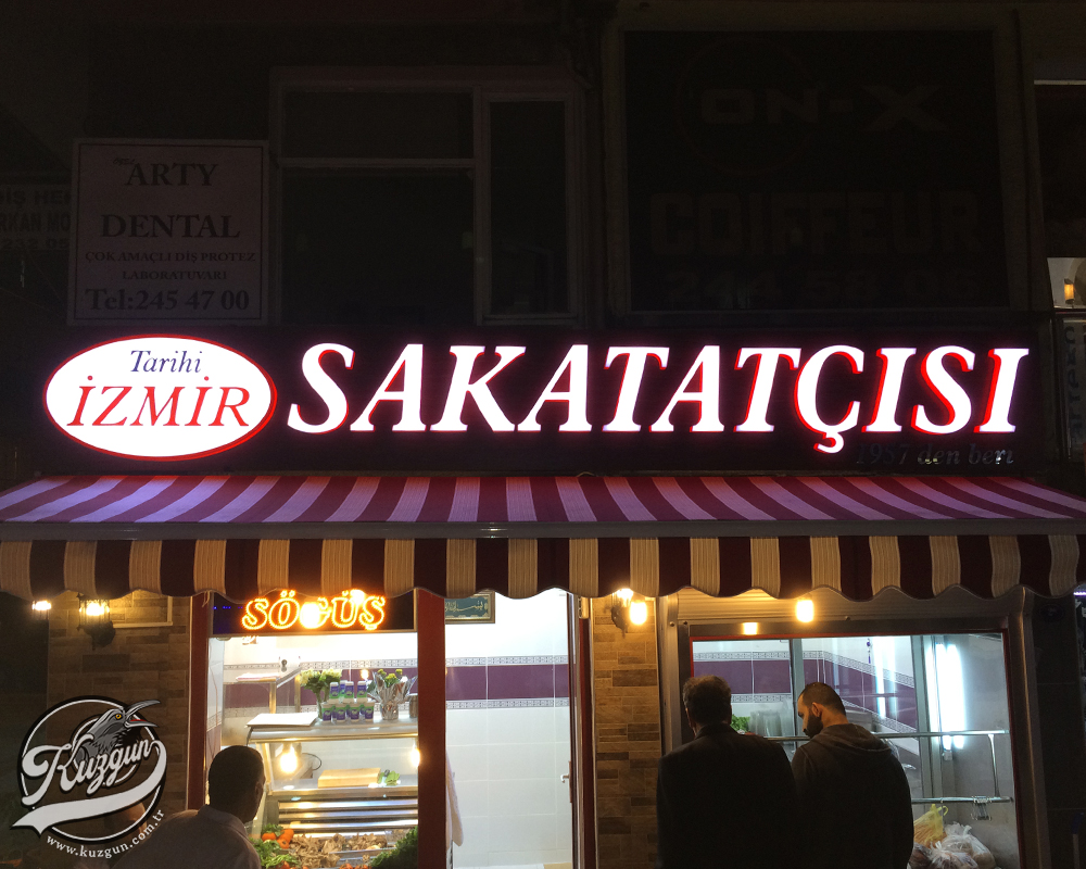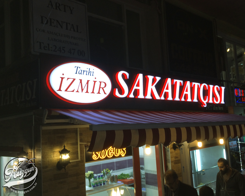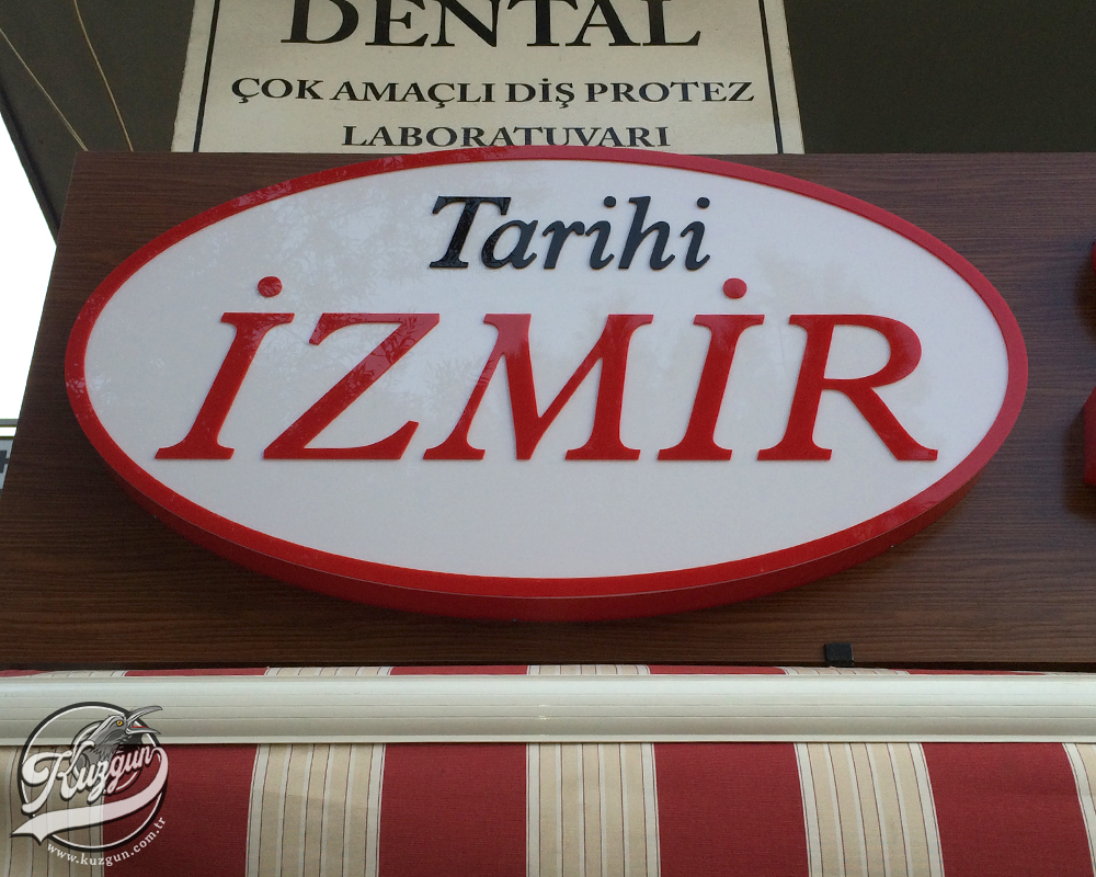Ahşap desenli alüminyum komposit zemin üzerine, modül ledli pleksi kutu harf çalışıldı. Ön yüzey beyaz, yan duvarlar kırmızı renk pleksiglass kullanıldı.